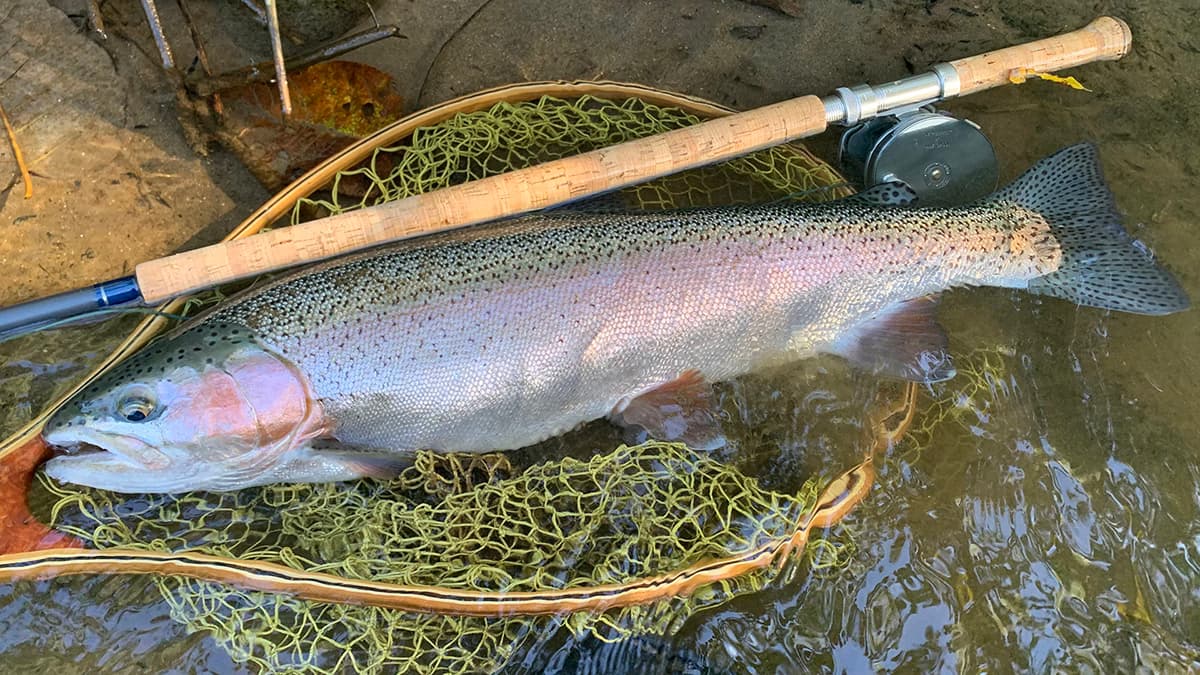 念願だった60オーバーの本流ニジマスのキャッチに成功、しかもウェットフライで釣るという目標も達成!