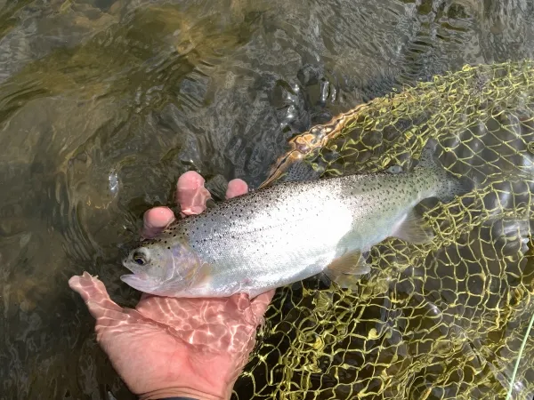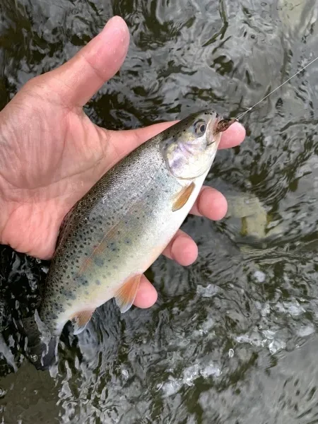 友達に案内されて初めてのポイントでドライフライに出たまあまあサイズのヤマメ。